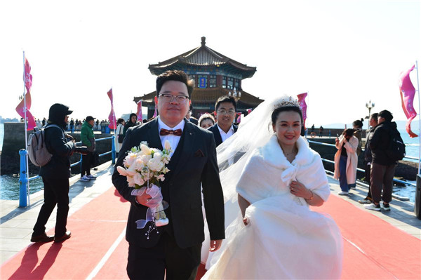 A group wedding ceremony is held at the century-old Zhanqiao Pier in Shinan district of Qingdao, Shandong province on Sunday. [Photo by Wang Haibin/for chinadaily.com.cn]