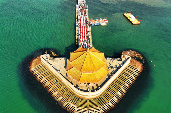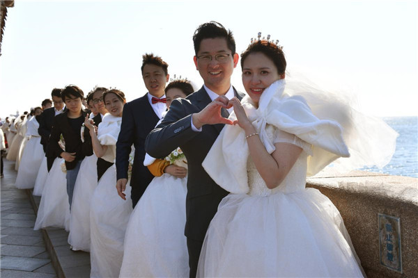 A group wedding ceremony was held at the century-old Zhanqiao Pier in Shinan district of Qingdao, Shandong province on Sunday. A hundred couples, holding flowers, made vows by the sea, pledging promises and joining hands in matrimony.
