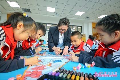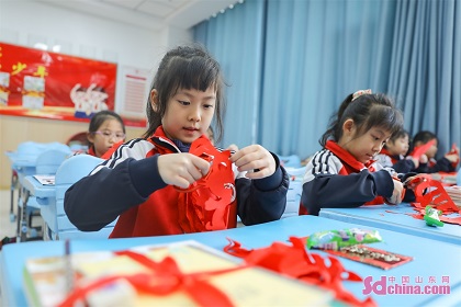 Students in Chongli Primary School in Qingdao, East China’s Shandong Province, learn to make paper cuts and shadow puppetry, and paint on kites to feel the charm of Chinese intangible cultural heritage on Feb. 6, the first day of spring term. (Photo by Zhang Ying)