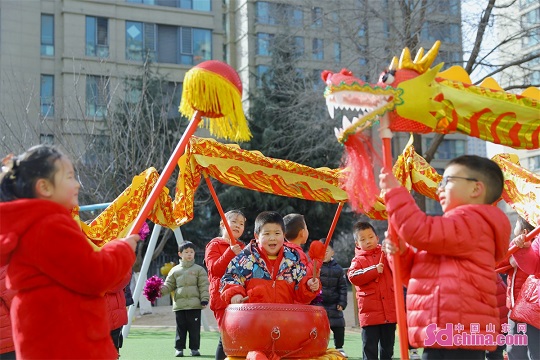 Photo taken on Feb.21, 2023, shows that kids celebrate the Dragon Heads-raising Day in Qingfeng Road Kindergarten in Qingdao, East China’s Shandong.(Photo by Zhang Ying)