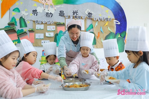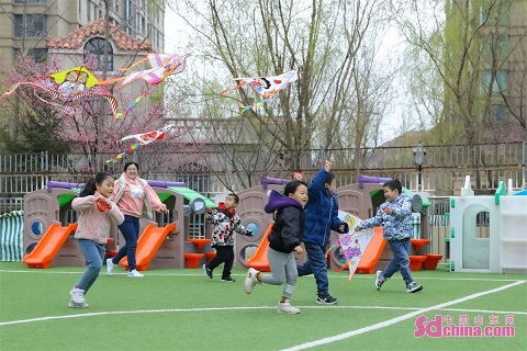 On the day of Spring Equinox, kids in Qingfeng Road Kindergarten in Licang District of Qingdao, China’s Shandong Province experienced kite flying, egg balancing and spring roll making to feel the charm of traditional culture. (Photo by Zhang Ying)
