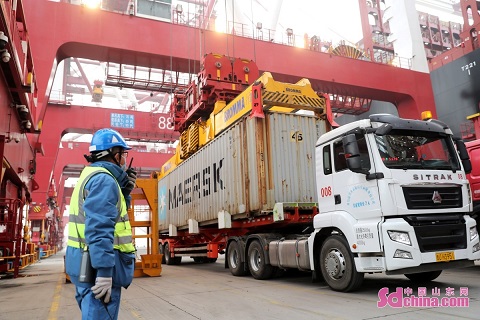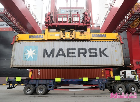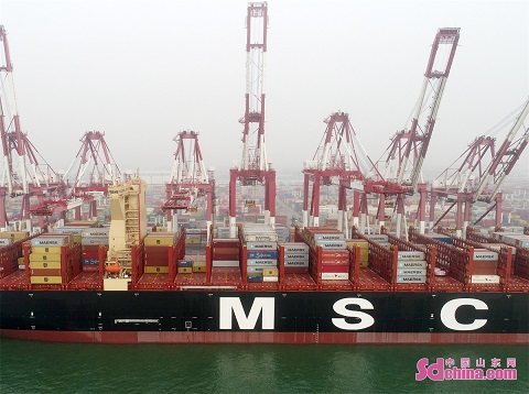 On March 23, MSC IRINA, world’s largest container ship developed by China, set sail at Qingdao Port, Shandong province, starting its first commercial tour after the delivery. The ship has a loading capacity of 7,500 TEUs at the port. With a total length of 399.99 meters and a width of 61.3 meters, the ship can carry 24,346 standard containers at a time. (Photo by Zhang Jingang)