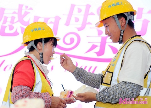 A heartwarming activity was held on a construction site in Qingdao, E China’s Shandong province to celebrate the Mother’s Day, with sons and daughters sending flowers, sunhats and cakes to their mother. (Photo by Zhang Jingang)