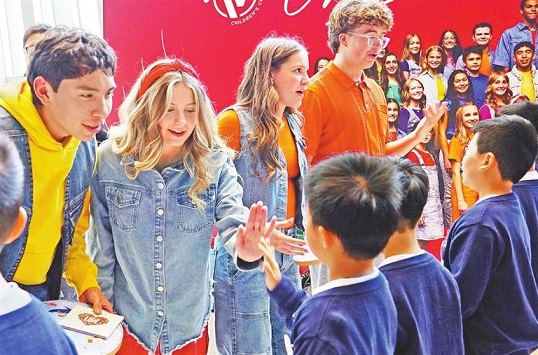 Members of the One Voice Children’s Choir from the U.S. are welcomed by their counterparts from the Beluga Boys’ Choir from Shenzhen yesterday afternoon. Lin Songtao