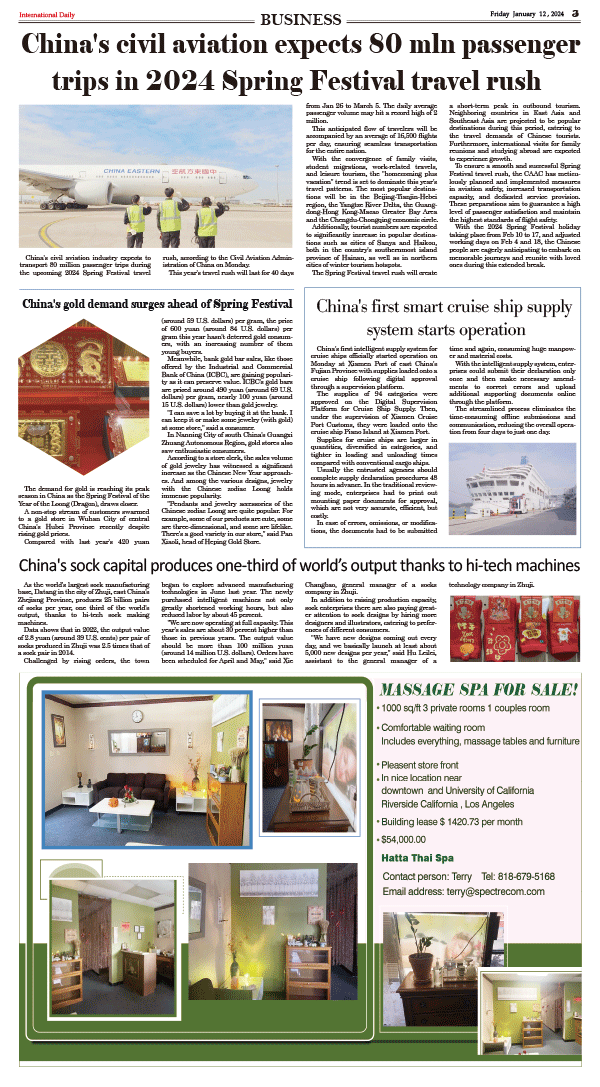 1/12-International Daily News-BUSINESS 发布日期:2024/1/15 来源: 打印