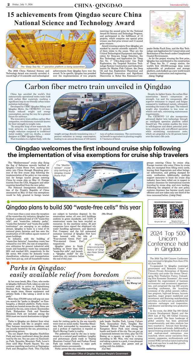 7/5-International Daily News CHINA.QINGDAO 发布日期:2024/7/6 来源:International daily 打印