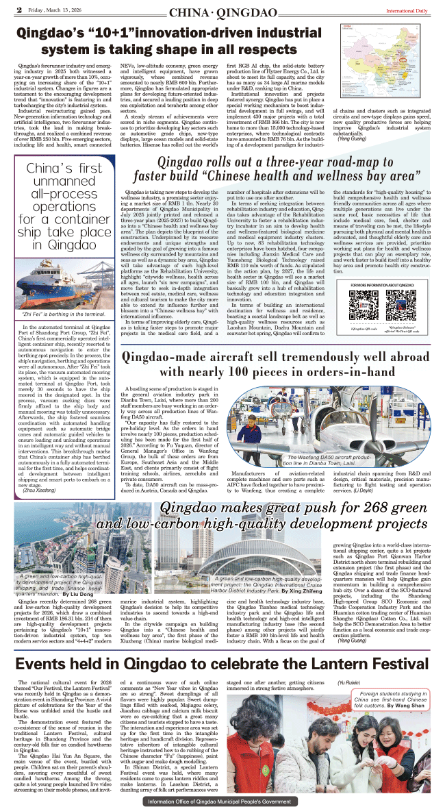 3/13-International Daily News-China Qingdao 发布日期:2026/3/13 来源:International daily 打印
