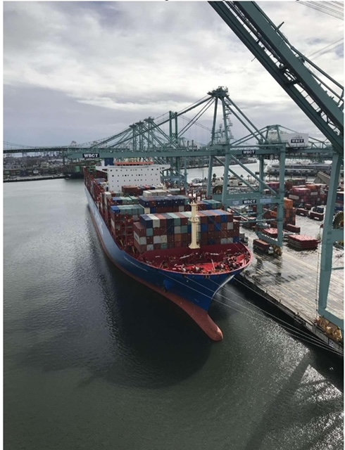 A cargo ship of China COSCO SHIPPING docks at the West Basin Container Terminal at the Port of Los Angeles. (Photo from COSCO SHIPPING (North America))