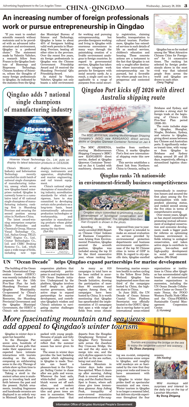 International Daily News supplement to The Los Angeles Times-CHINA QINGDAO 发布日期:2026/1/28 来源:International daily 打印