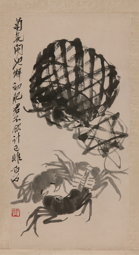 身处北方的白石老人和屈大均一样爱蟹。这幅《蟹篓》图中画了竹篓和几只螃蟹,笔墨雄浑滋润,螃蟹造型简练生动,意境淳厚朴实。从题款可知此刻正是菊花开、蟹正肥的时候。金风送爽,持螯赏菊,历来是我国食俗生活的重要组成,也是千百年来文人墨客吟咏挥毫的题材之一。