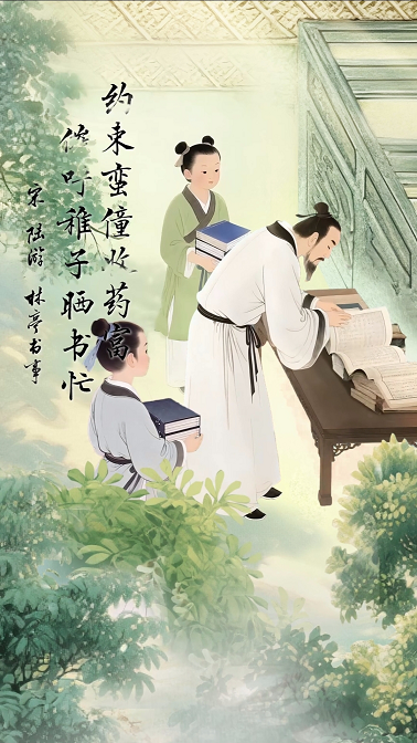“小暑夏安 晒书晒衣”。金辉抚过书页,沉睡的文字被唤醒,不只是防虫驱霉的智慧,更是对传承的守望。书案旁,书童捧着绯红水蜜桃,眸光清亮如夏晨,齿尖咬破果肉的瞬间,清甜汁水迸溅,暑气消融在果香里。