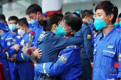 Their teammates and relatives had already been waiting at the airport with flowers and gifts in hand. When the rescue team got off the plane to meet their relatives and friends, everyone was excited to tears.