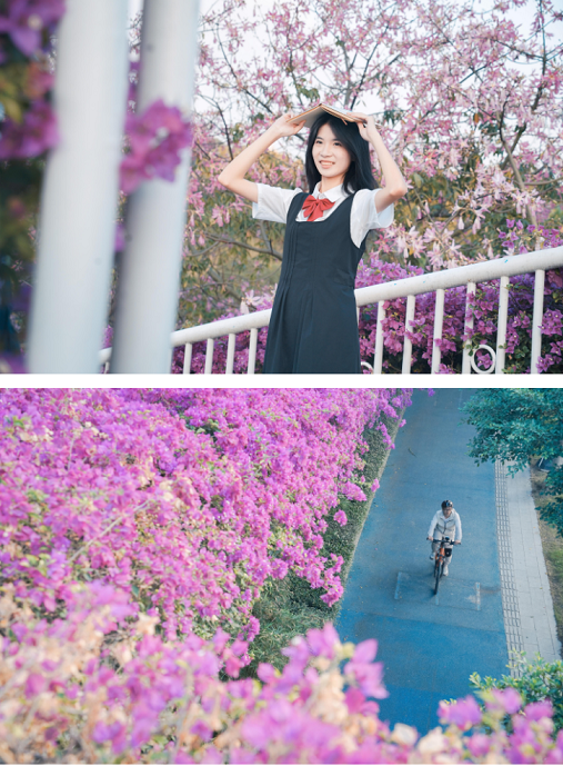 Guangzhou, famously known as the "Flower City," is never devoid of flowers. Even during the period surrounding the Frost's Descent, the flourishing bougainvillea embellishes every corner of the city, from parks to flyovers. On a pedestrian bridge near Changping Subway Station, delicate pink bougainvillea flowers cascade down from the structure, resembling a magnificent "flower waterfall." This breathtaking sight has recently become a social media sensation in Guangzhou, drawing numerous visitors to come and take photos.