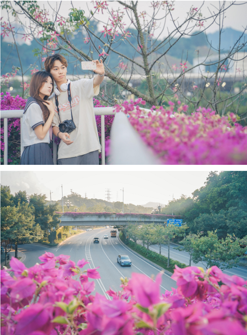 花城不缺花,即便是秋季霜降前后,广州各大公园、立交桥上,都能看到三角梅繁花锦簇热情盛开。近日,在广州地铁长平站附近的一处天桥上,粉嫩的三角梅从桥上倾泻而下,如同一座艳丽“花桥”,成为近期社交媒体火热的广州秋季打卡点,吸引许多市民游客前来拍照。