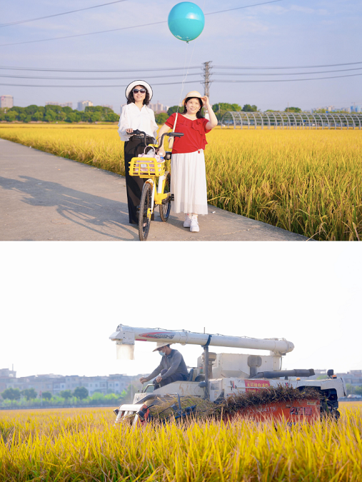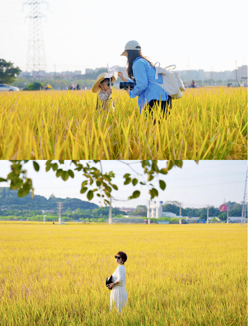 The rice fields in Dongguan showcase the harvest scene, attracting many visitors to take photos