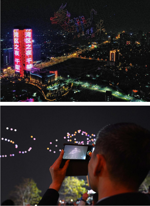 On the evening of January 4th, a spectacular light show performed by 1,000 UAVs was staged over Jiujiang, Nanhai District, Foshan City. They presented multiple sets of light movements that interacted with the city lights, creating a wonderfulscene for the public. Not only did it convey wishes for the new year, but it also vividly depicted the vigorous development of Jiujiang, as well as the happiness and well-being of its people.