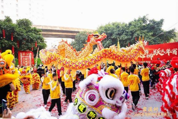 龙狮巡游、醒狮采青、武术表演、千人宴席……今年的元宵佳节,广州市白云区棠景街辖内棠溪、棠下、沙涌北三条村展开了一年一度的元宵主题活动,吸引不少周边居民共同庆贺,现场锣鼓齐鸣、龙腾狮跃,热闹非凡。