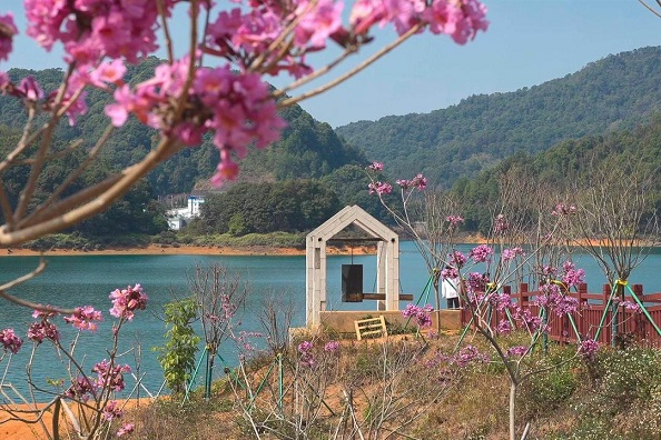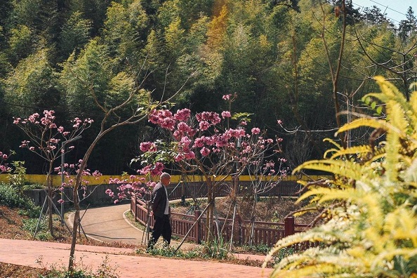 Lutian Town in Conghua District, a 100-kilometer drive from downtown Guangzhou, conceals a "green secret realm"— Xiaoshan Village, dubbed the "Lugu Lake of Guangzhou." Nestled beside Asia's largest pumped-storage hydroelectric power station, the village boasts upper and lower reservoirs covering a combined area of 7.4 million square meters. Once a barren slope known as Dujiaozui in Xiaoshan Village, this land has transformed into a renowned flower-viewing destination. Hundreds of blooming plants line the greenway, their branches adorned with clusters of fluffy, ball-shaped blossoms.