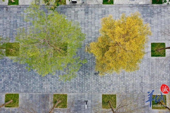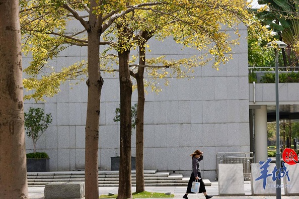 Lingnan: Beauty Beyond Borders | Recently, Shenzhen’s streets have been painted in hues of gold as the terminalia mantaly sheds its leaves, creating an autumn-like scene in the heart of spring. As a common roadside tree in the city, it undergoes this transformation each early spring due to fluctuating temperatures. The shift between warm and cool weather accelerates water evaporation from the leaves while the roots struggle to supply enough moisture, prompting the tree to "change leaves"—as old foliage turns yellow and falls, making way for fresh new sprouts. #SplendidLingnan