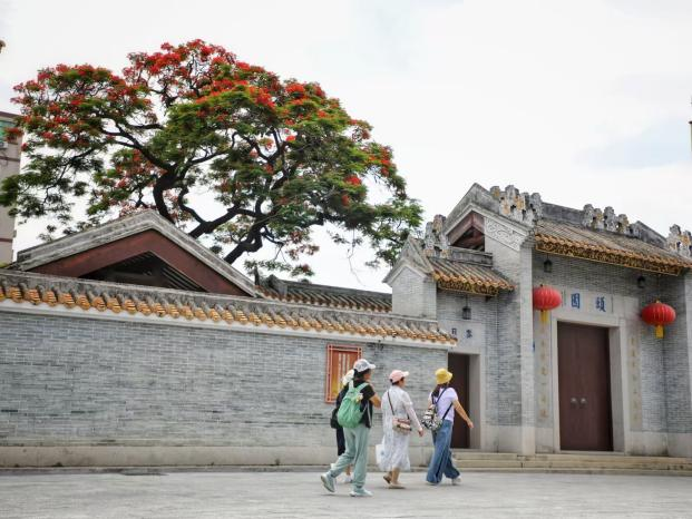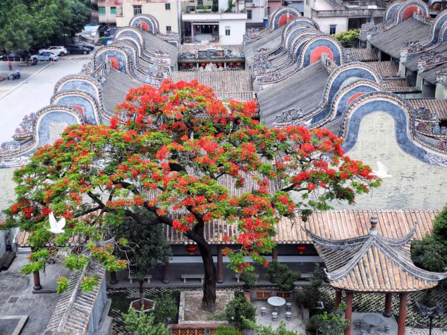 Lingnan: Beauty Beyond Borders | The Delonix regia at Zhou Clan Ancestral Hall in Nancun Village, Baiyun District, Guangzhou, which gained viral fame last May, is approaching its annual peak bloom. With vivid scarlet blossoms expected to crown its branches within a week, this natural marvel stands ready to recreate its internet-breaking spectacle. This month, the village's lotus flowers will also enter their blooming season, allowing visitors to enjoy both the Delonix regia and lotus blossoms during this time.#SplendidLingnan