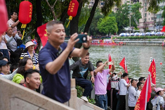 5月24日,2025年白云区龙舟公开赛在石井河激情上演,18支队伍约800名运动员上演“群龙争霸”。河面上的龙舟劈波斩浪,两岸观众则呐喊声、欢呼声不断。记者现场采访多位观众,他们用“血脉觉醒”“兴奋激动”等词来形容这场文化盛事。