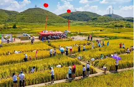 在韶关市乳源瑶族自治县大桥镇中冲村、核桃山村、三元村等村,一望无际的稻田上卷起千层金色稻浪,一群群村民或游客欢声笑语抓鱼嬉戏,一架架收割机来回收割成熟的水稻……可见山乡一幅画,金稻浪千重。