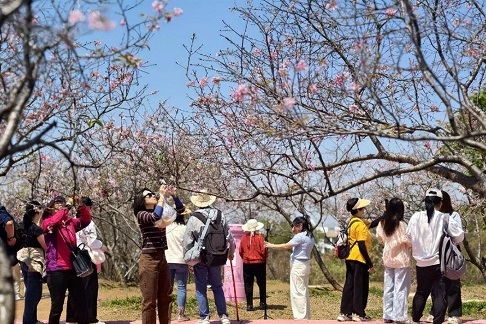 The 4th Nansha Cherry Blossom Festival opened on March 14 at Eighteen Arhats Mountain, where thousands of cherry trees are gradually awakening. Eighteen Arhats Mountain currently features two major cherry gardens with staggered blooming periods, allowing for a longer cherry?blossom viewing season.