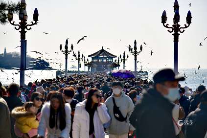 春节假日后的第三天,本应该恢复平静的栈桥,依然人山人海。今天上午,作为经典地标的栈桥又一次展现出超高人气。赶来看海鸥、观大海的游客摩肩接踵,整个太平路沿线人行道上,也站满了游客。栈桥两侧沙滩上,游客们近距离地和海鸥嬉戏。当海鸥成群飞过,人们纷纷举起相机拍照,定格下这新年最美的瞬间。(青岛日报/观海新闻记者 王雷 摄影报道)