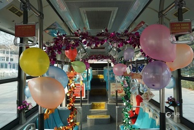 写满甜蜜话语的卡片、彩色气球、玫瑰花朵、交友信息……2月14日是情人节,在这个有爱的日子里,城运控股交运温馨巴士31路、604路、607路、608路、隧道8路装扮一新,变身“爱情巴士”穿行于青岛街头。