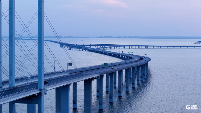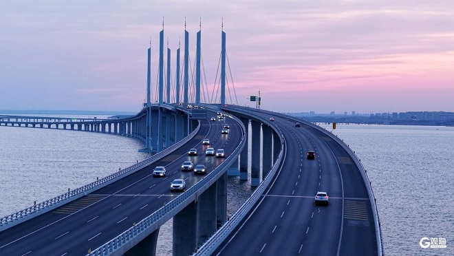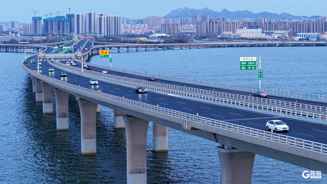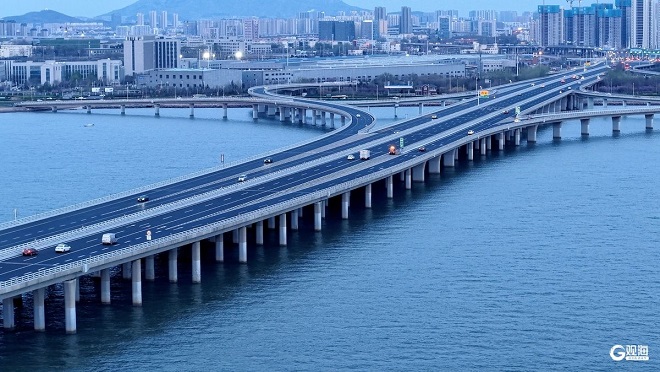 暮色浸染海天之际,俯瞰胶州湾大桥,橘红色的霞光为“钢铁巨龙”披上纱衣。川流不息的车灯如流动的星河,在桥身蜿蜒闪烁。大桥横跨碧波,刺破暮色,延伸向无垠远方,与粼粼海面、渐暗天际勾勒出雄浑壮阔的海上长卷,奏出人类智慧与自然伟力的壮美交响。(青岛日报社/观海新闻记者 徐稚媚)