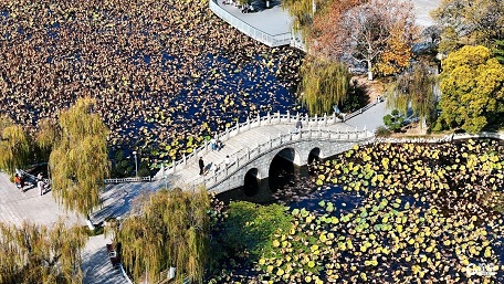 秋末冬初的青岛,美得诱人。位于青岛西海岸新区的双珠公园,黄的透亮、红的热烈、绿的苍翠,五彩秋叶层层叠叠,在阳光下流转着斑斓光泽。湖面荷叶虽褪去盛夏繁绿,残叶疏影却别有韵味,与岸边彩林相映成趣,勾勒出清润雅致的秋景。