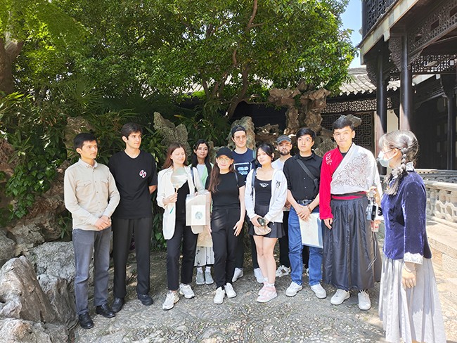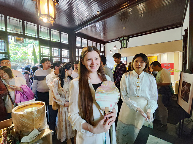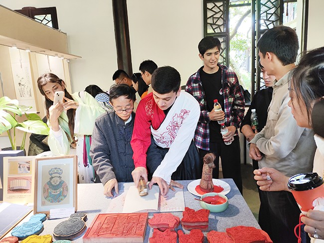 啟動儀式結束後,國際友人、外國留學生等50多人踏上了一段何園深度體驗之旅。他們穿梭於古老與現代交織的園林之中,被何園獨特的魅力深深吸引。在非遺工作室裏,他們親手體驗了文創雕版和漆扇製作。隨後,他們身著漢服,在何園內悠然遊園,宛如一幅幅流動的畫卷。