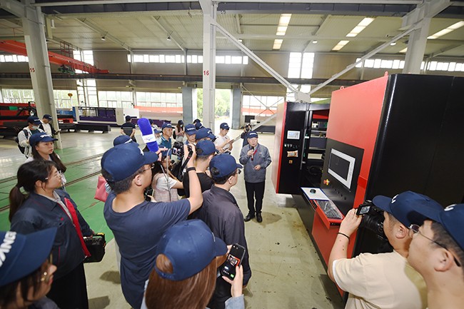 隨後採訪團一行又走進了揚力集團。揚力集團面向汽車領域開發的大型智能化偏載多工位壓力機,是國內多工位閉式壓力機的首臺套產品,整體性能達到國際先進水準,具有智能化、柔性化、複合化、數位化的特徵,是汽車製造領域的高端產品。“以前也經常來到揚州,但是沒有這麼近距離接觸企業的文化和生命力,能感受到高質量的發展在揚州能體現得特別明顯,也能感受到揚州的經濟澎湃的一個動力。”中國新聞社江蘇分社記者葛勇說道。“走進數控車間、重機車間。聽到廠房裏機器的轟鳴,看到產業工人專注的神情,我們一定會通過圖片、文字、視頻,全方位的展現揚州的高質量的發展,采出高質量,寫出高質量。”