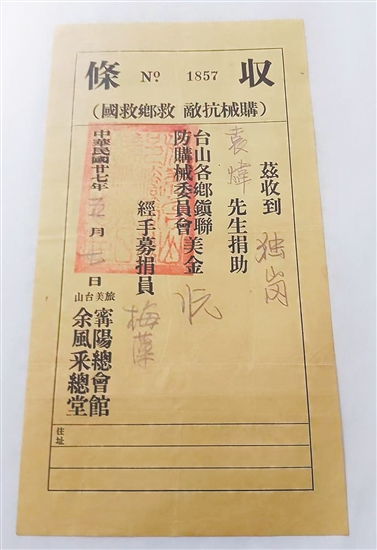 據統計,李春榮累計捐贈史料達214件(份),其中不乏極具歷史價值的華僑捐款憑證,包括《紐約全體華僑抗日救國籌餉總會證明書》《華僑拒日救國後援總會捐款收條》《旅美臺山寧陽總會館、餘風采總堂抗敵救鄉救國捐款收條》《墨西哥尾利打抗日救國後援會捐款收條》等。