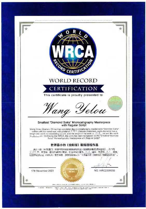 當天,廈門書法家王業樓獲世界紀錄認證機構(WRCA)兩項世界紀錄認證:字數最多的佛教經典極限微楷作品、世界最小的《金剛經》極限微楷作品。