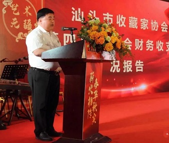 柯文彬会长发表了感言:他说二十年来,在各级主管部门的大力支持下,在各位领导的关心指导下,在汕头市收藏家协会历任会长的带领下,我们遵守党和国家的政策法规,以传承和弘扬中华优秀传统文化为己任,发挥“藏品”文化融合其他经济信息交流的平台和桥梁作用,取得丰硕的成果。今天,我们相聚一堂,举行协会第五届第一次全体会员大会暨理事会选举工作,取得圆满成功离不各位理事和会员们的大力支持,表示衷心的感谢!特别要感谢吴霞会长的无私奉献和卓越领导,使整个协会的团队精神满满正能量。我将不负重托,跟大家一起,群策群力,团结一致,把我们的协会建设得更加美好,为我国优秀传统文化的传承和弘扬做应有的担当;为汕头市的创文工作添砖加瓦;以“收藏”这一平台去与社会各界构建更深的友谊拓宽更多的资源,以藏品经济去协助其他经济的高质量发展贡献我们的力量”。