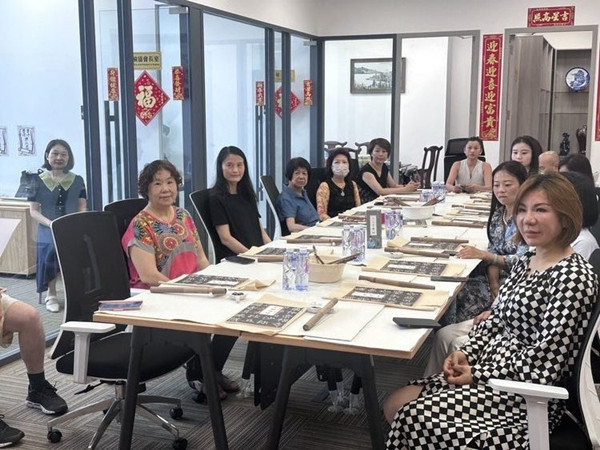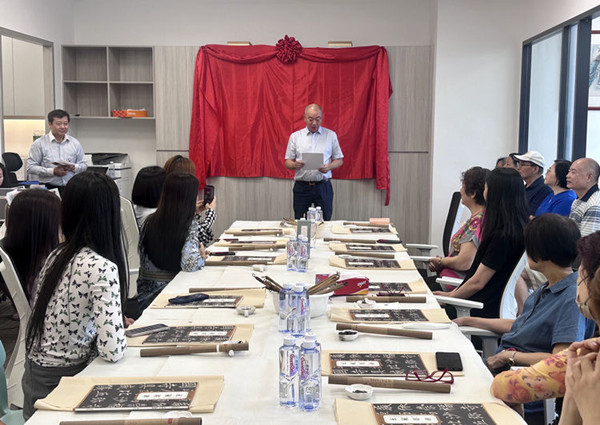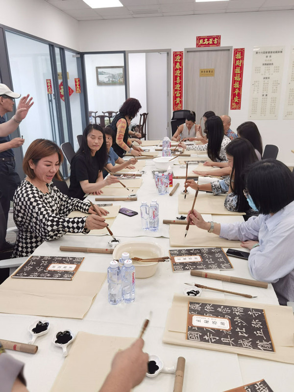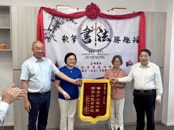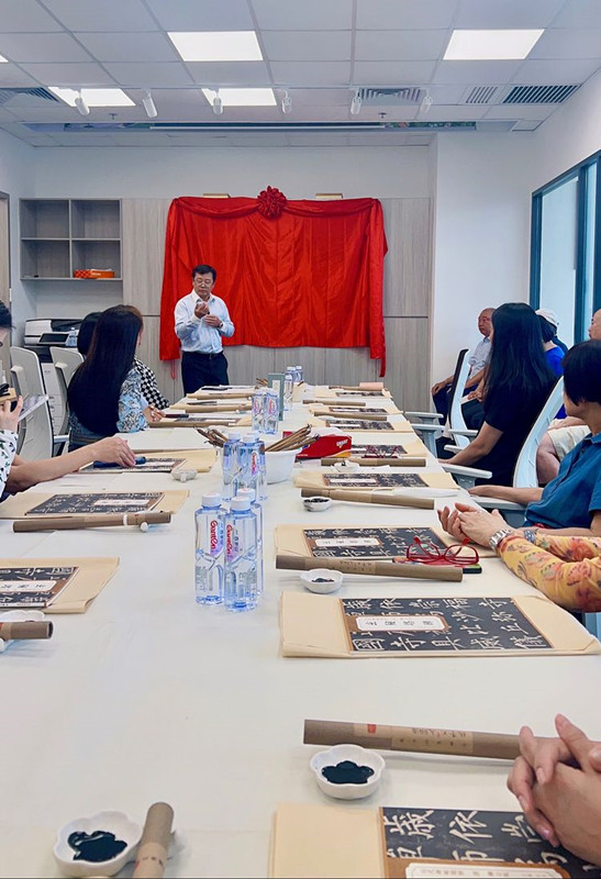 左起:朱国华常务副会长、林际平会长、陈成炉会长、方秋云会长、陆惟华博士、侯杏妹教授为书法班开学点赞