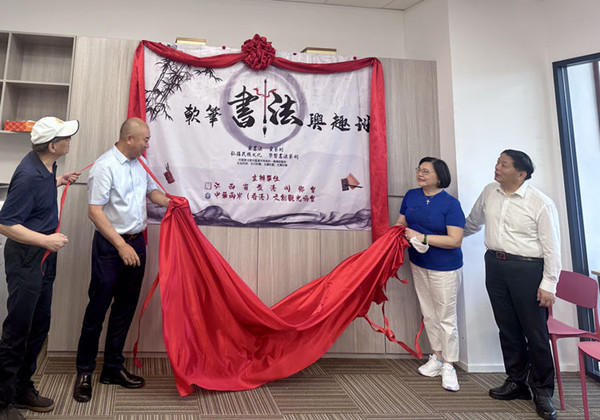 左起:林际平会长、陈成炉会长、方秋云会长、陆惟华博士为书法班开学典礼揭牌
