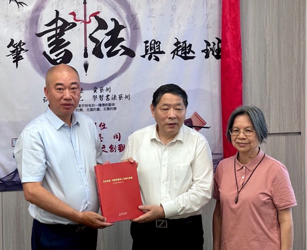 侯杏妹教授(右)、陆惟华博士(中)将天津海外联谊会主编的《文化中国·世界华侨华人书画作品集》赠予了江西省旅港同乡会会长陈成炉先生留念