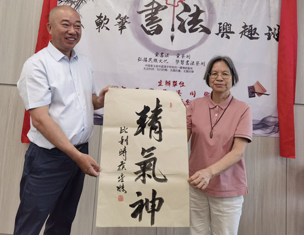侯杏妹教授与陈成炉会长向学员们展示了侯杏妹老师书写的书法:精气神